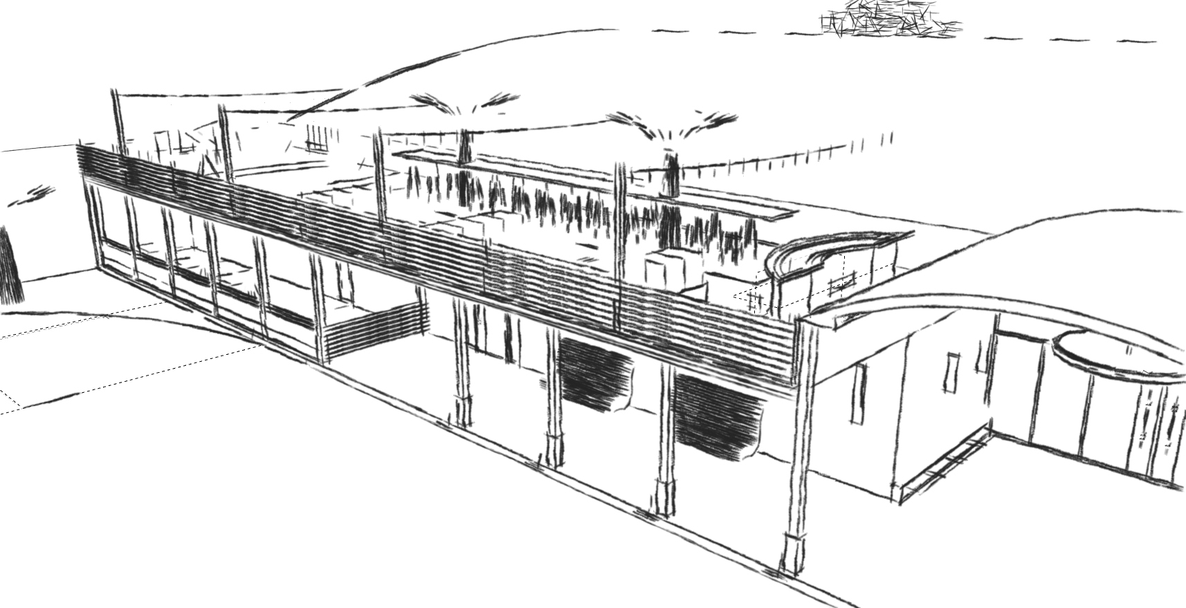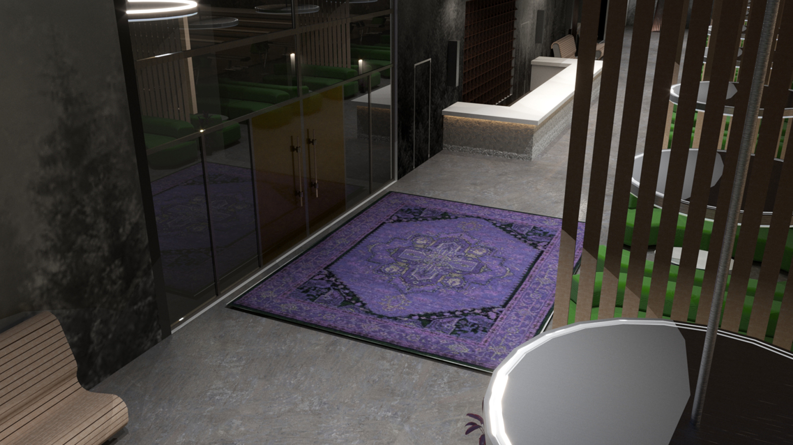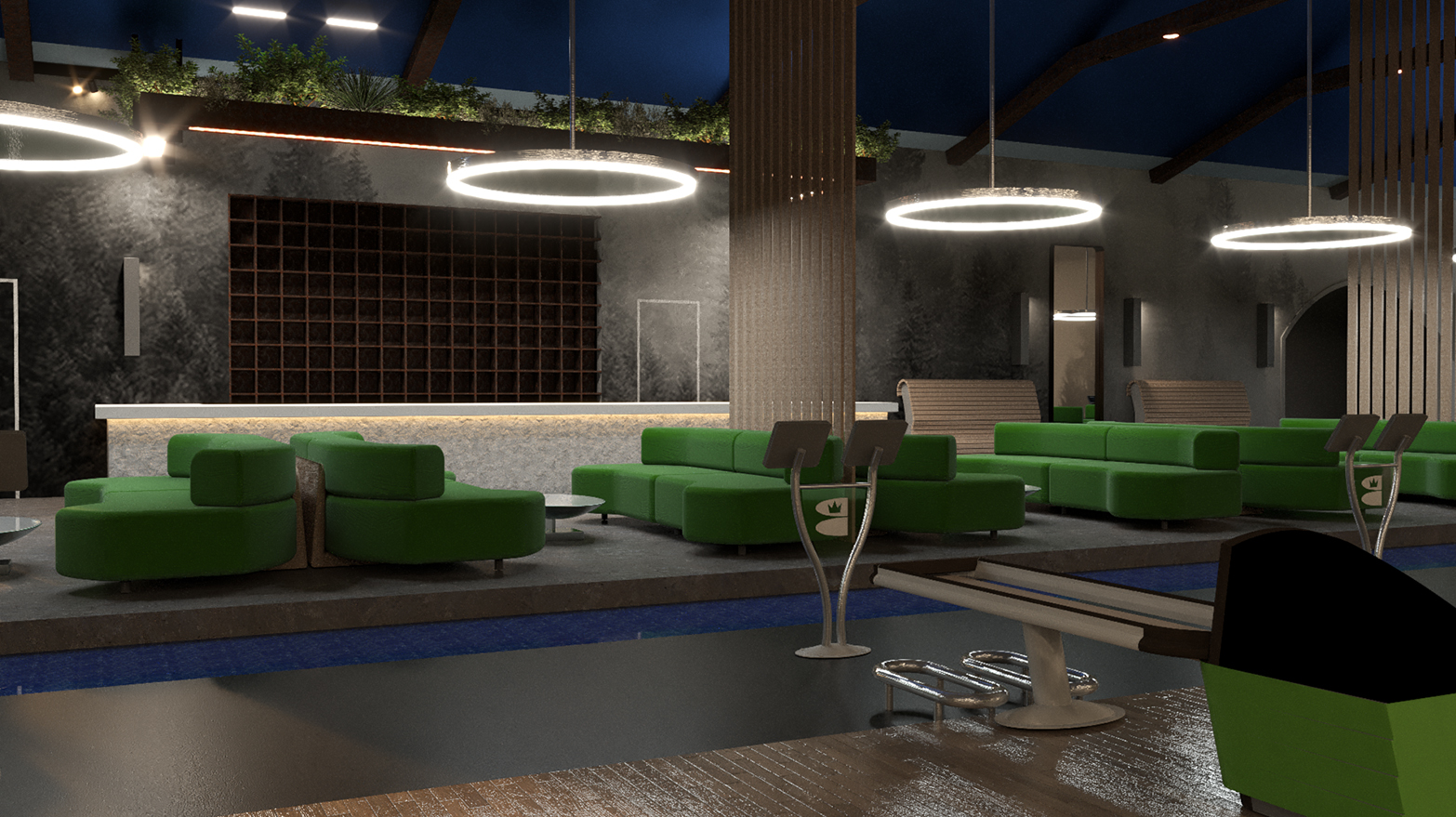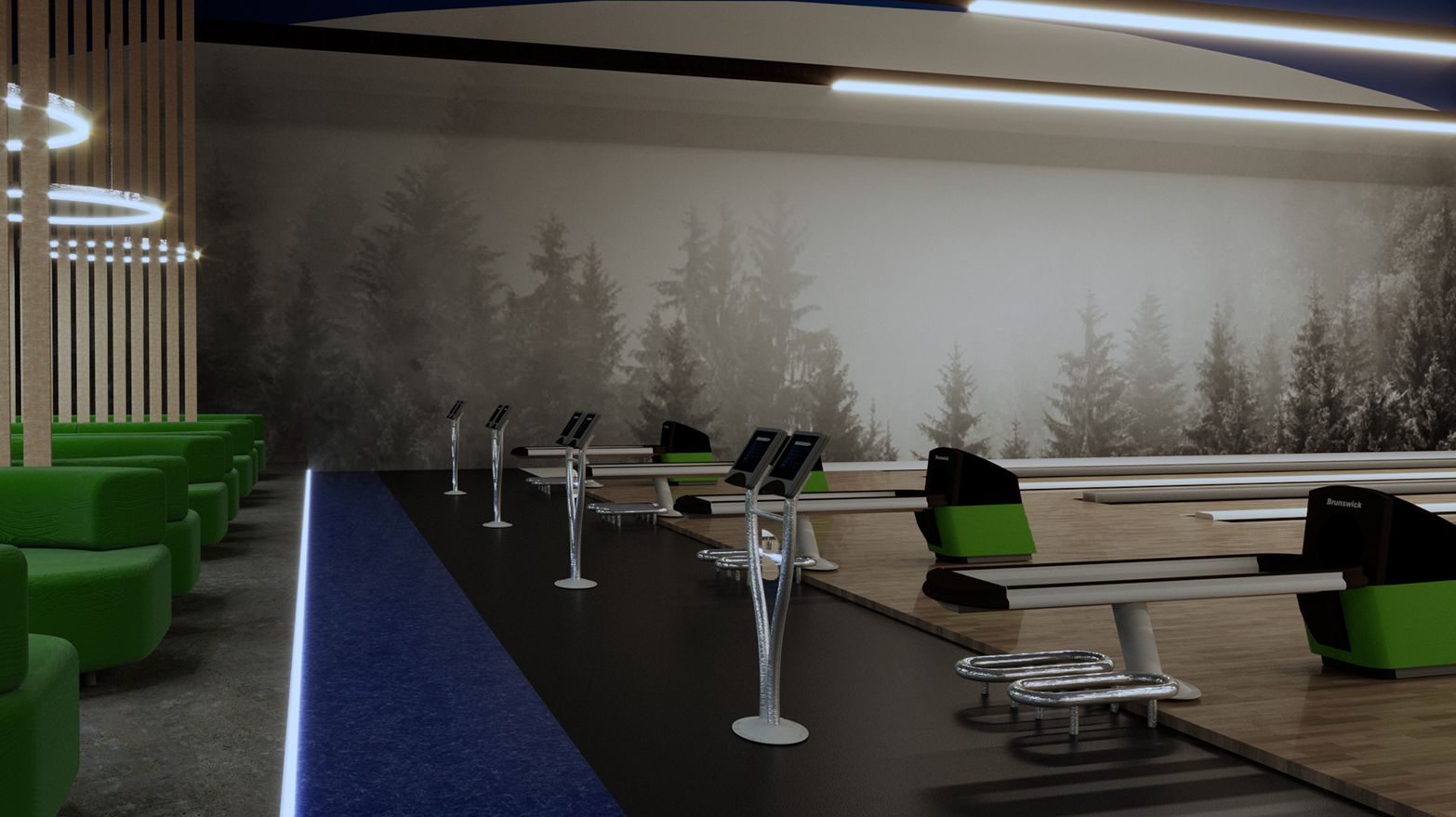 Airy partitions provide a bit of privacy and vertical interest in the long, linear space. Graceful bench seating provides new spaces to watch or wait for lanes. Comfortable furniture replaces the current tables and chairs. The carpet is removed, and the concrete polished, providing for a contemporary and easily maintained, non-absorbent flooring.