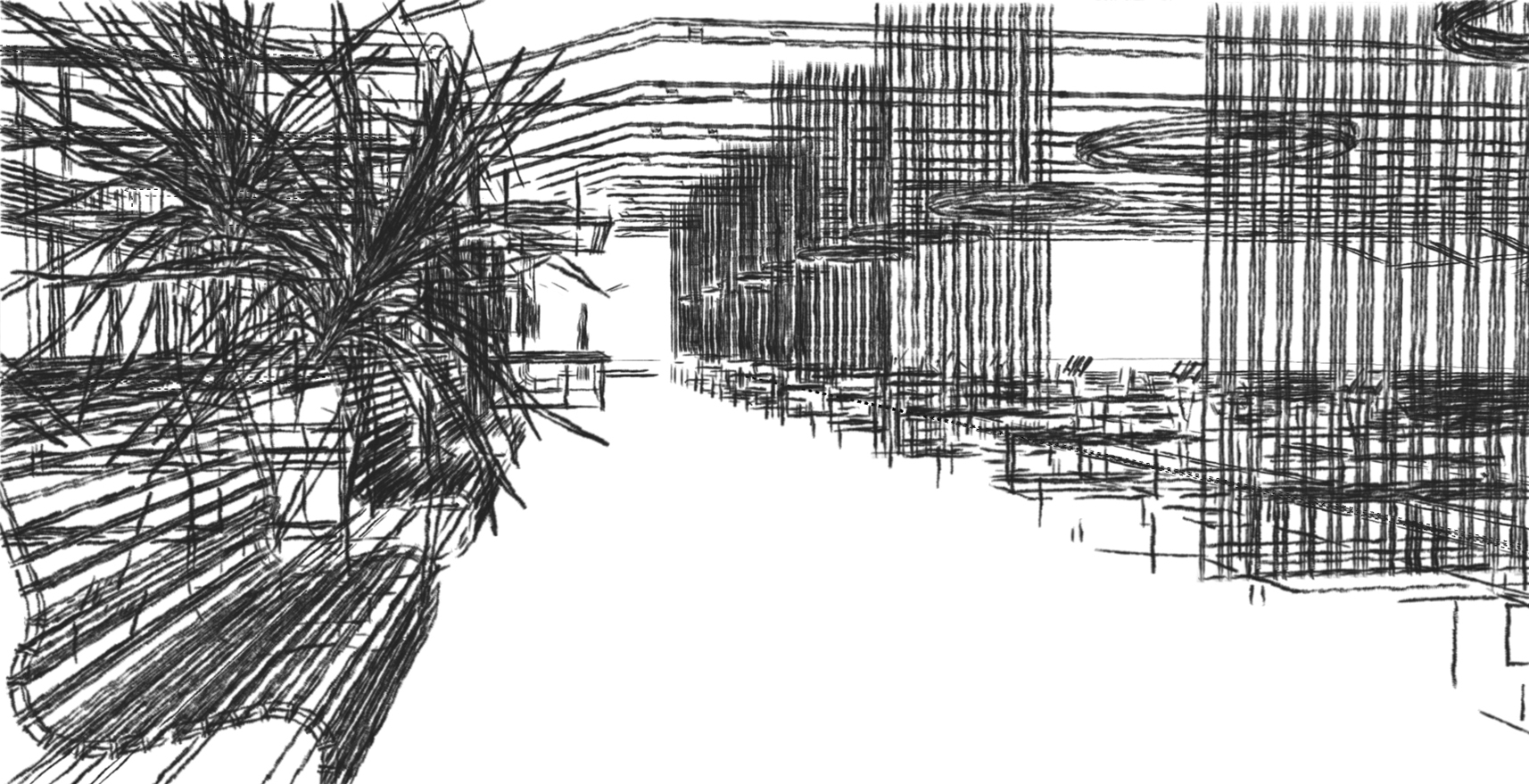 Removing the existing drop ceiling exposes a vaulted, cavernous space which we’ll paint ‘big-sky-blue.’ The girders provide a perfect surface for soft, lane lighting. Floor to ceiling murals give a misty-mountain vibe, emphasize the inherent volume and height of this space, and create depth.