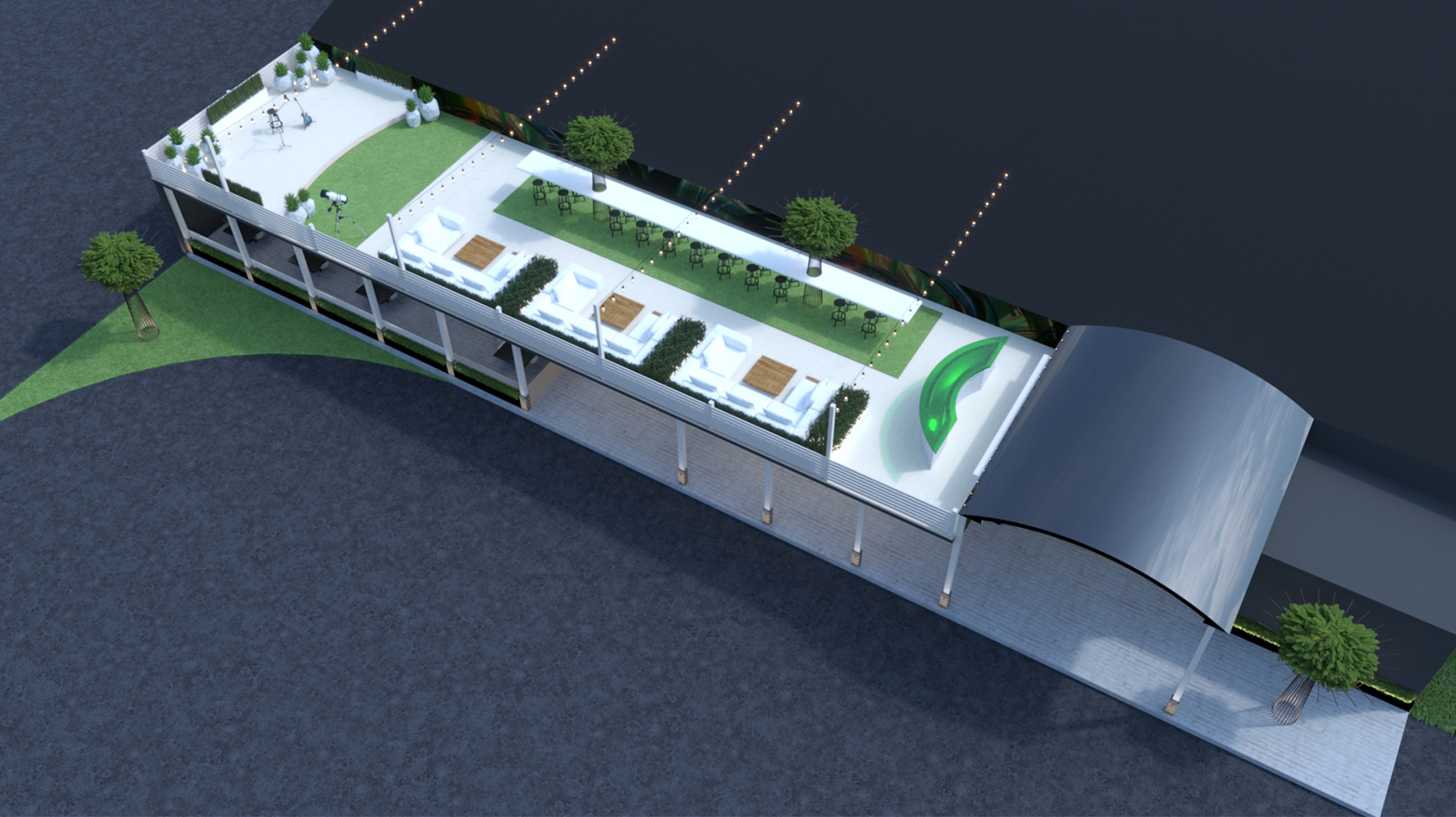 The rooftop lounge takes advantage of existing, unused space and creates an ultra-hip, picturesque place to hang out day or night. This will be a breathtaking space to book for concerts and private parties.