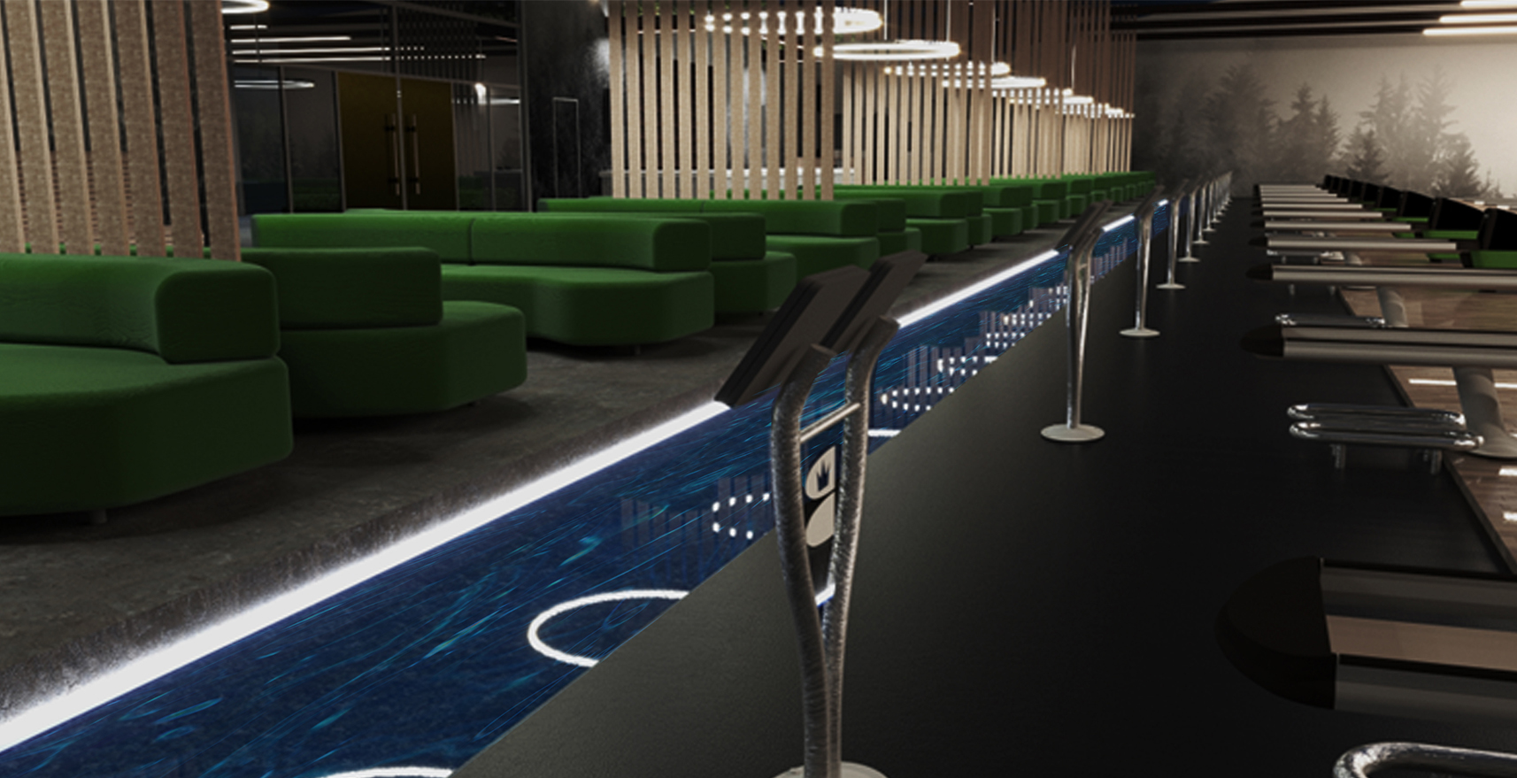 A strip of lit blue epoxy (think ‘mountain creek’) creates the illusion of depth and motion while providing safe lighting between floor levels. Ball returns get a shiny coat of green. And black utility flooring creates a unique, cost-effective and practical surface between foul line and 2nd approach.