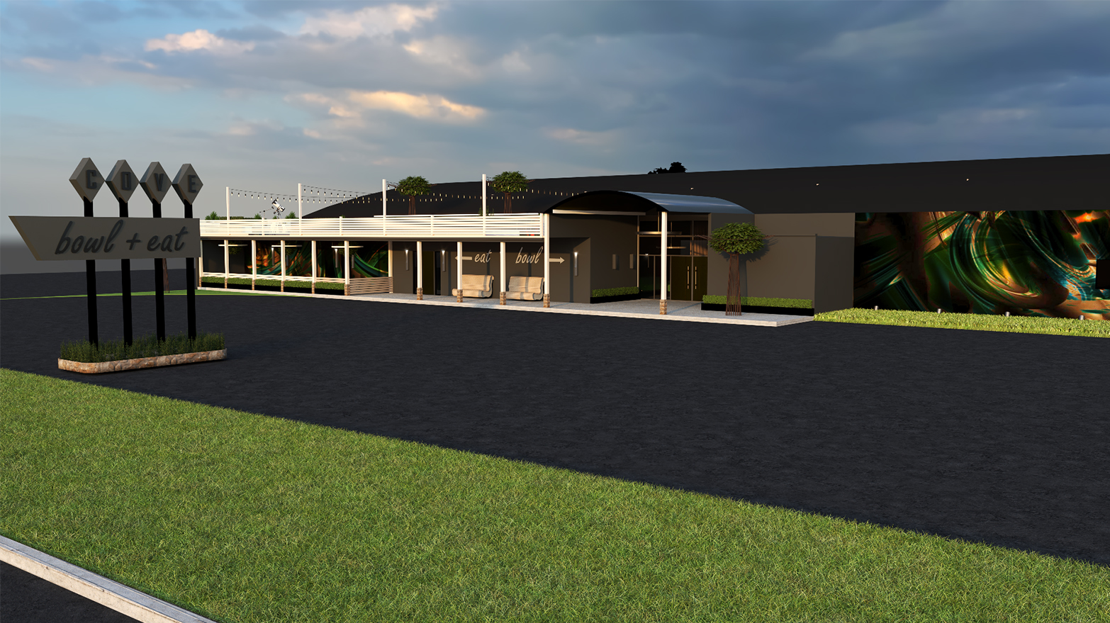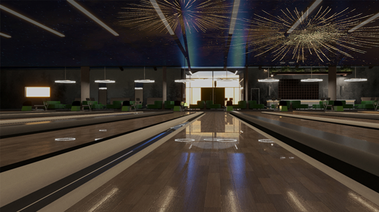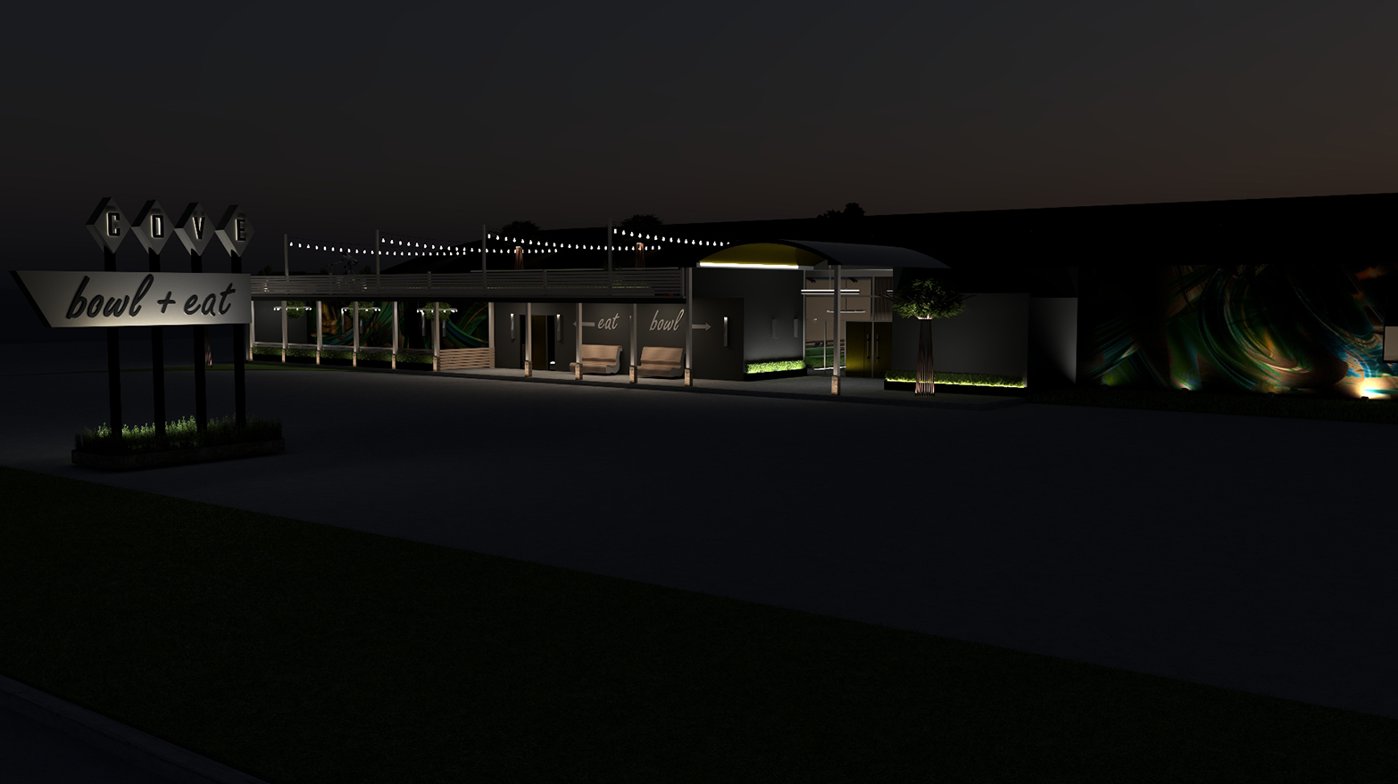 The conceptual design calls for a rebranding of the space as a whole—perhaps a new, notable restaurant and bar get re-named with bowling in mind: