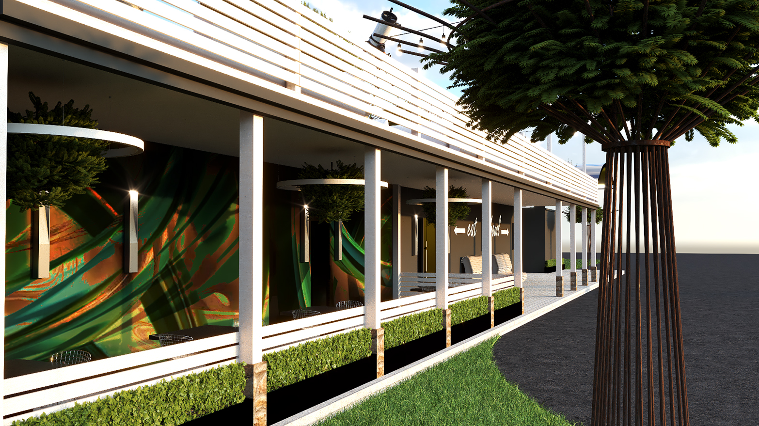 Uplighting and a manicured approach give the alley an upscale resort/arrival feel. Everything 'glows' and our perception of what an alley looks and feels like begins to shift. The existing entrance gets an overhaul. A glimpse of the ‘big blue sky’ inside blurs the line between the out and indoors.