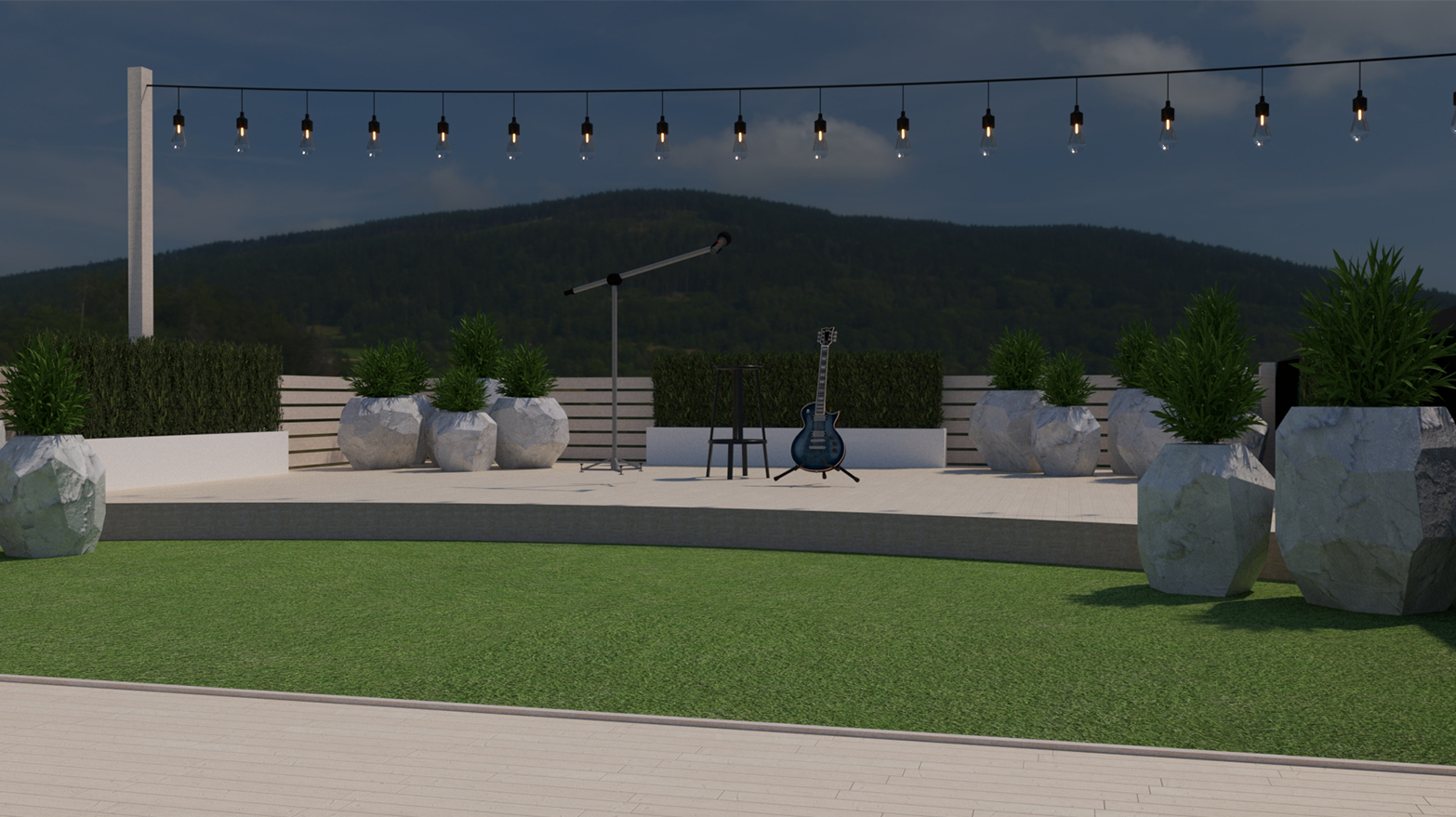 Turf by the stage for sitting on the grass. Might even be used for a little lawn bowling.